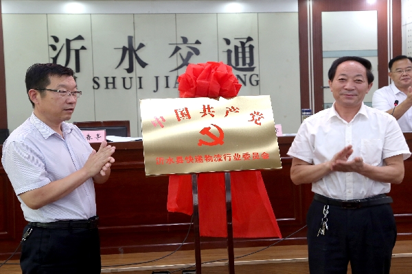 县交通运输局党组书记、局长,县快递物流行业党委书记程培军同志和县委组织部部务委员、党性教育中心主任王春亭同志共同为“中国共产党沂水县快递物流行业委员会”揭牌。