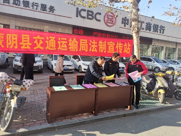 蒙阴县交通运输局专门在蒙阴广场设置了法制宣传站。通过宣传栏展示,悬挂横幅,以及分发、解读交通法律法规宣传资料等方式,积极向广大市民宣传宪法知识和交通法律法规。同时,部分工作人员到浩阳物资有限公司和振兴物流公司等运输企业,向运输业户宣传交通法律常识和安全生产知识,提高企业从业人员守法意识。此次主题宣传活动共发放普法宣传册和各类宣传材料560余份,发放宣传包80余份,现场解答群众咨询80余人次。