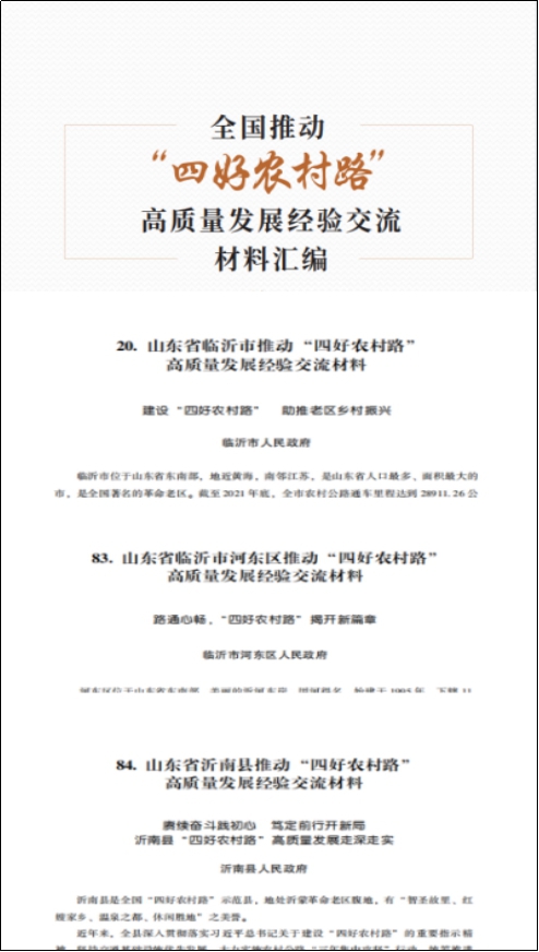 近日,临沂市《建设“四好农村路”助推老区乡村振兴》、河东区《路通心畅“四好农村路”揭开新篇章》、沂南县《赓续奋斗践初心笃定前行开新局--沂南县“四好农村路”高质量发展走深走实》等多篇文章经验入选《全国推动“四好农村路”高质量发展经验交流材料汇编》,并在2022年全国推动“四好农村路”高质量发展会议上印发推广。