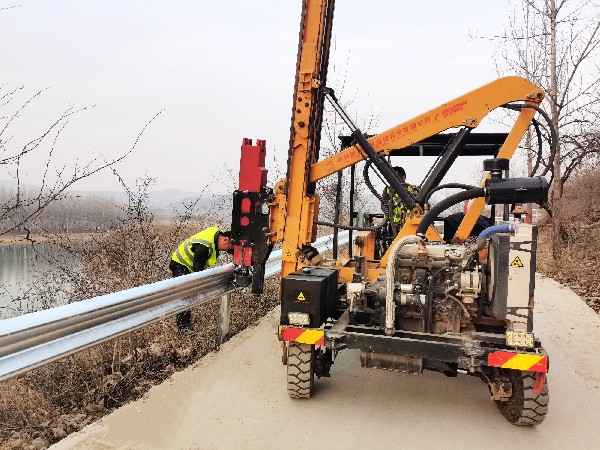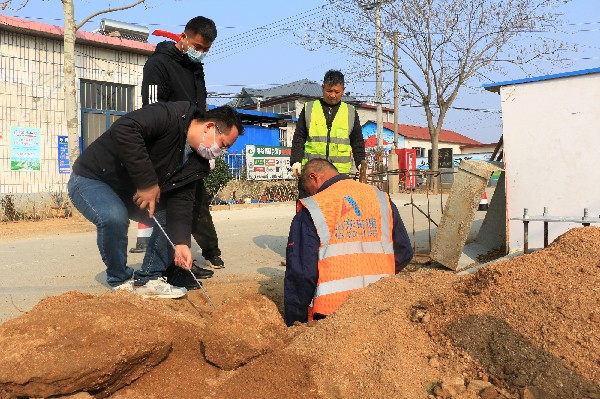 在另一个施工现场常路镇大常路至薛家上峪村乡道路段上,也是一派热火朝天的施工场景。护栏施工的同时,标志牌、警示桩底座挖坑、浇筑混凝土施工也在同步进行。