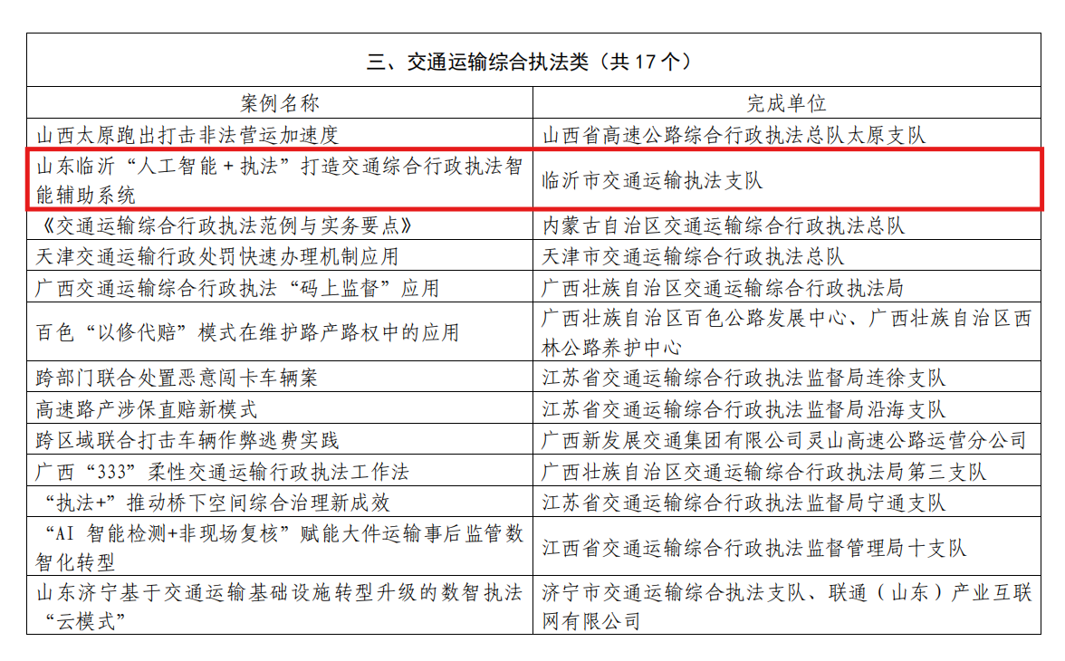 近日,中国公路学会法律工作委员会公布了“2025年度公路交通行业法治工作创新案例”评选结果,临沂市交通运输执法支队申报的《“人工智能+执法”打造交通综合行政执法智能辅助系统》,经多轮评审,成功入选交通运输综合执法类创新案例。